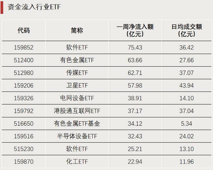 资金净流入方面,1月12日至16日,净流入额最多的10只ETF,多是行业ETF,包括软件、有色金属、传媒、卫星等行业的联系家具。软件ETF(159852)上周净流入额达75.43亿元,是上周净流入额最多的ETF。与此同期,宽基ETF成交活跃,A500ETF易方达(159361)等追踪中证A500指数的ETF成交额最初。