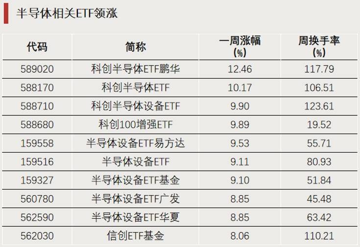 1月12日至16日,半导体联系ETF领涨,周涨幅排行前十的ETF,大齐是这类ETF。其中,科创半导体ETF鹏华和科创半导体ETF周涨幅卓越10%,排行前二,半导体设立ETF易方达(159558)等追踪半导体材料设立指数的家具阐扬也较为亮眼。另外,科创100增强ETF和信创ETF基金周涨幅也卓越8%,位居涨幅榜前十。本年以来放肆1月16日,科创半导体ETF鹏华、科创半导体ETF等多只半导体联系ETF涨幅照旧卓越了20%,在全市集合最初。