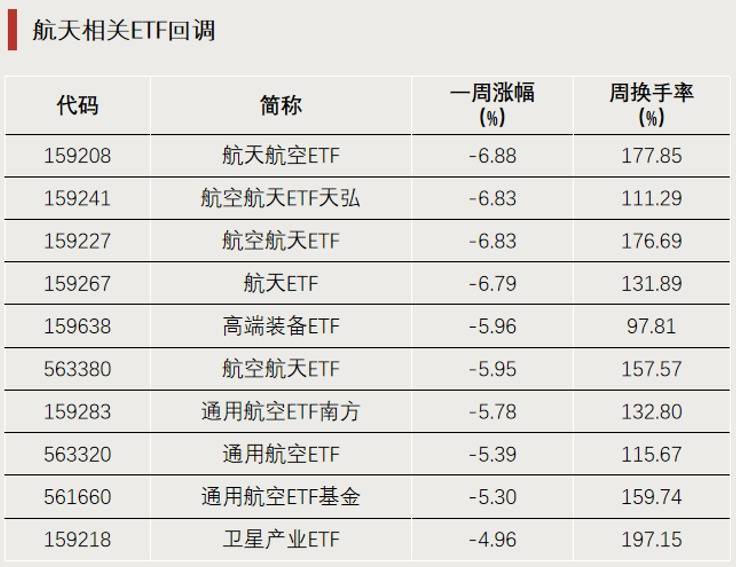 1月12日至16日,备受市集体恤的生意航天、卫星等前期热点板块出现回调,航空航天、卫星等联系ETF跌幅居前,航天航空ETF、航空航天ETF天弘、航空航天ETF(159227)、航天ETF领跌,周跌幅均卓越6%;高端装备ETF、通用航空ETF南边、卫星产业ETF等跌幅较大,周跌幅均卓越4%。值得一提的是,多只航空航天和卫星联系ETF出现了较高的周换手率,卓越100%。
