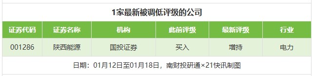 评级调低方面,1月12日至1月18日,国投证券对陕西动力的评级从“买入”调低至“增抓”。