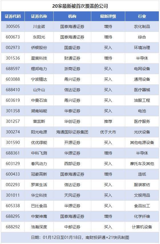 初次袒护方面,1月12日至1月18日券商共给出了60次初次袒护,其中川金诺、东阳光均赢得国泰海通证券予以“增抓”评级,侨银股份赢得国盛证券予以“买入”评级,星宸科技赢得财通证券予以“增抓”评级,煜邦电力赢得浙商证券予以“买入”评级。