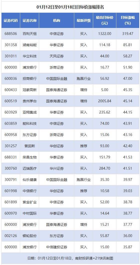 南财投研通数据知道,1月12日至1月18日,券商予以上市公司观念价共92次,按最新收盘价预备,观念价涨幅排行居前的公司有百利天恒、湖南裕能、华立科技,观念价涨幅永别为319.47%、85.81%、58.27%,永别属于化学制药、电板、娱乐用品行业。
