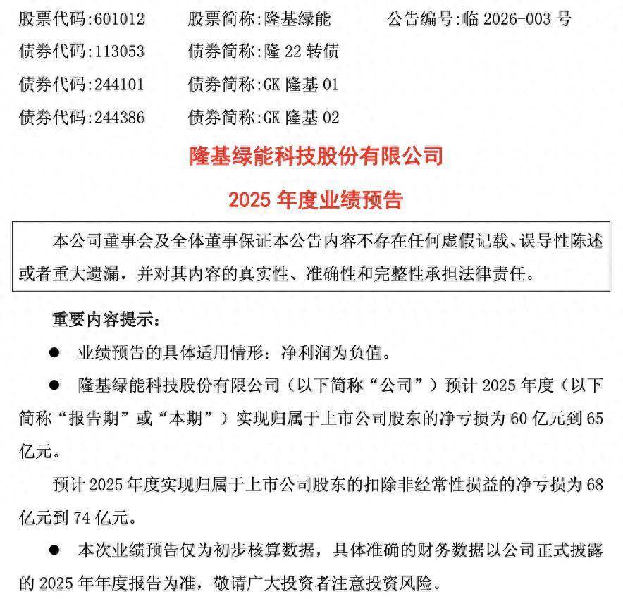 1月18日,隆基绿能(601012)露出2025年度功绩预报,经财务部门初步测算,瞻望2025年度完竣包摄于上市公司股东的净耗费为60亿元到65亿元。瞻望2025年度完竣包摄于上市公司股东的扣除非无为性损益的净耗费为68亿元到74亿元。