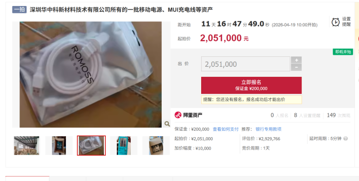 4月7日,阿里财富王法拍卖网站透露,深圳华中科新材料时候有限公司(下称“华中科新材料”)名下的一批迁徙电源、充电线等财富,将以205.1万元的起拍价公开拍卖,评估价约为292.98万元,拍卖时期为4月19日10时至4月20日10时。