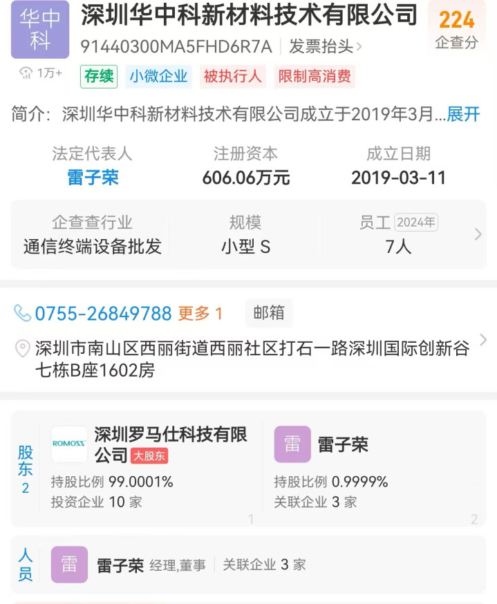 企查查平台透露,深圳华中科新材料时候有限公司成立于2019年3月,注册成本606.06万元,由罗马仕执股约99%、法定代表东说念主雷子荣执股1%。