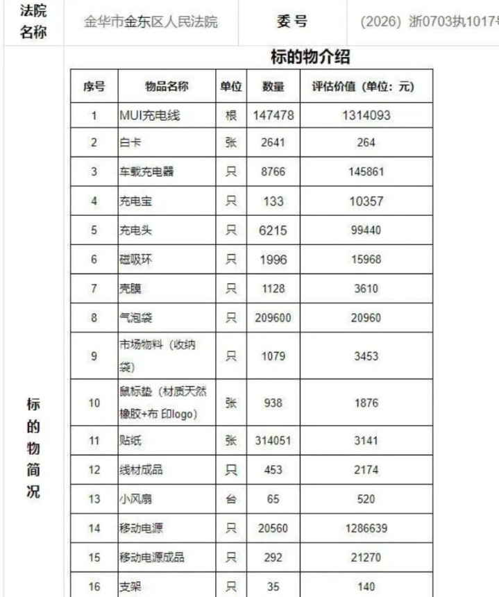 这次被拍卖的方针物主要包括:147478根MUI充电线,评估价约131.4万元;20560只迁徙电源,评估价约128.7万元。此外还有车载充电器、小电扇、磁吸环等物品。潇湘晨报·辣椒财经记者搜索该拍卖信息,开云体育官方网站发现现在0东说念主报名,有8东说念主竖立提醒,149次围不雅。