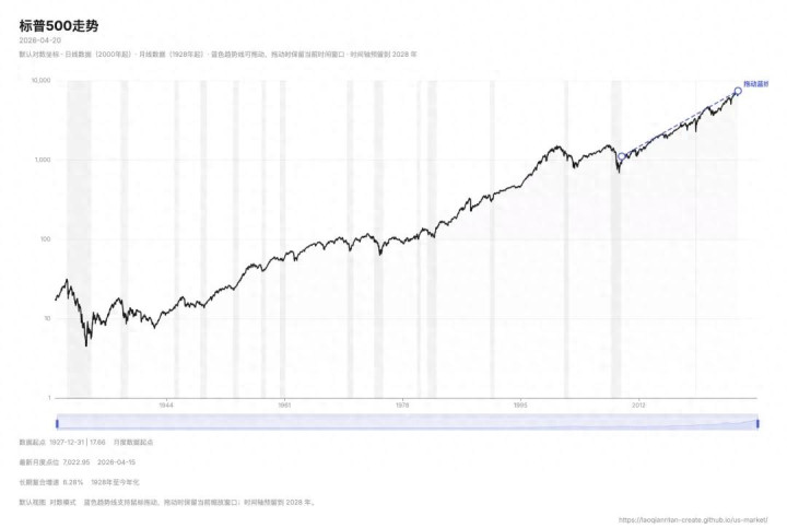 因为在对数坐标视角下,标普500一直永恒在轨说念上沿运行。