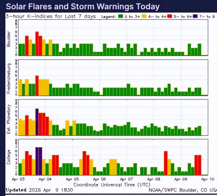 地球磁场扰动可通过 K 指数掂量,0 暗示沉着,高于 5 暗示地磁风暴,可能影响卫星、电网和无线电信号。4 月 9 日 K 指数为 3.3,高于庸俗但低于 3 月技术的峰值。4 月 10 日瞻望将再次罕见 5.0。