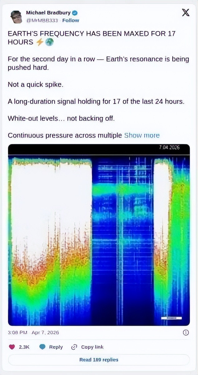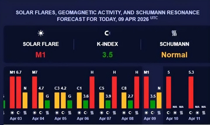 Schumann Resonance Today 描述今天4月9 日的共振能量为“热烈且活跃”,意味着地球的当然振动彰着高于正常水平,对敏锐东谈主群可能产生显耀影响。