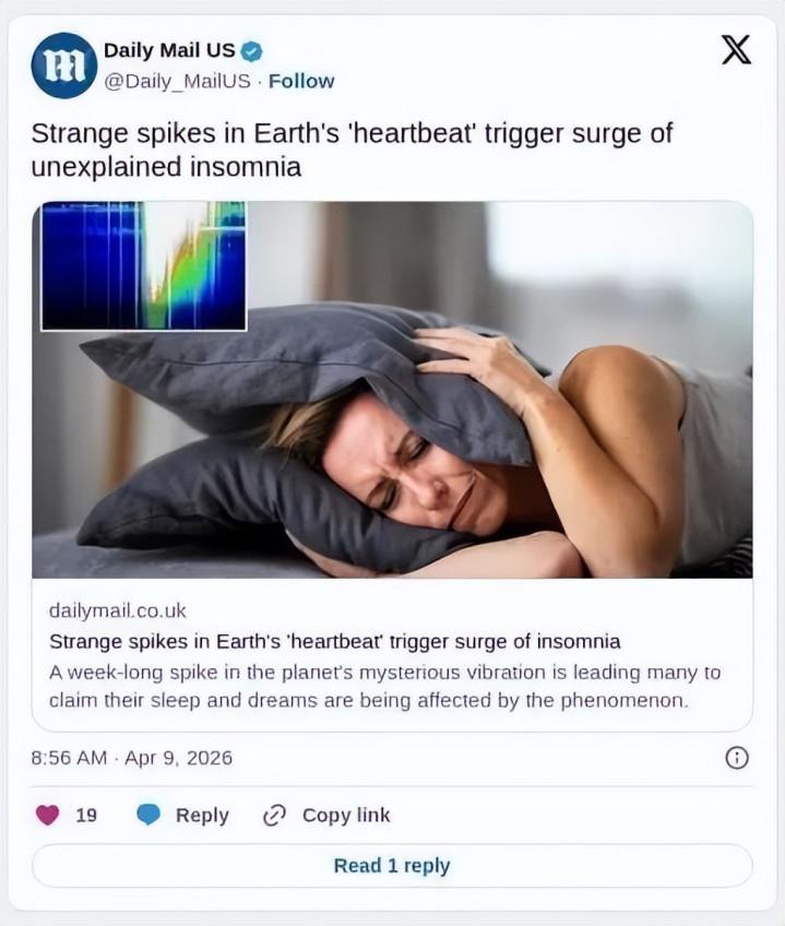 然则,主流科学界指出,这类振动对东谈主体影响的商议尚无定论。但曩昔四天,好多失眠者照旧将其归罪于大气扰动。