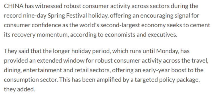 马来西亚《星报》23日报谈称,在创记录的9天春节假期技巧,中国各限制花费活动强劲,这为世界第二大经济体平定复苏势头传递了积极信号,也彰显了花费者信心。