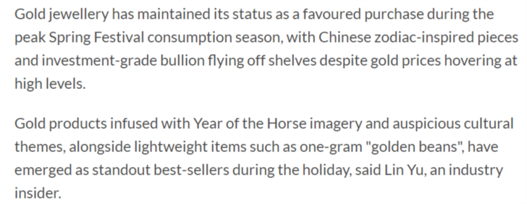 报谈还称,黄金珠宝在春节花费旺季捏续保捏热点购买地位,尽管金价处于高位,但生肖主题谋略的黄金饰品和投资级金条还是畅销。报谈征引业内东谈主士的话称,融入马年元素和祯祥文化主题的黄金居品,以及如一克“金豆”等质地较轻的居品,在节日历间成为最畅销的品类。