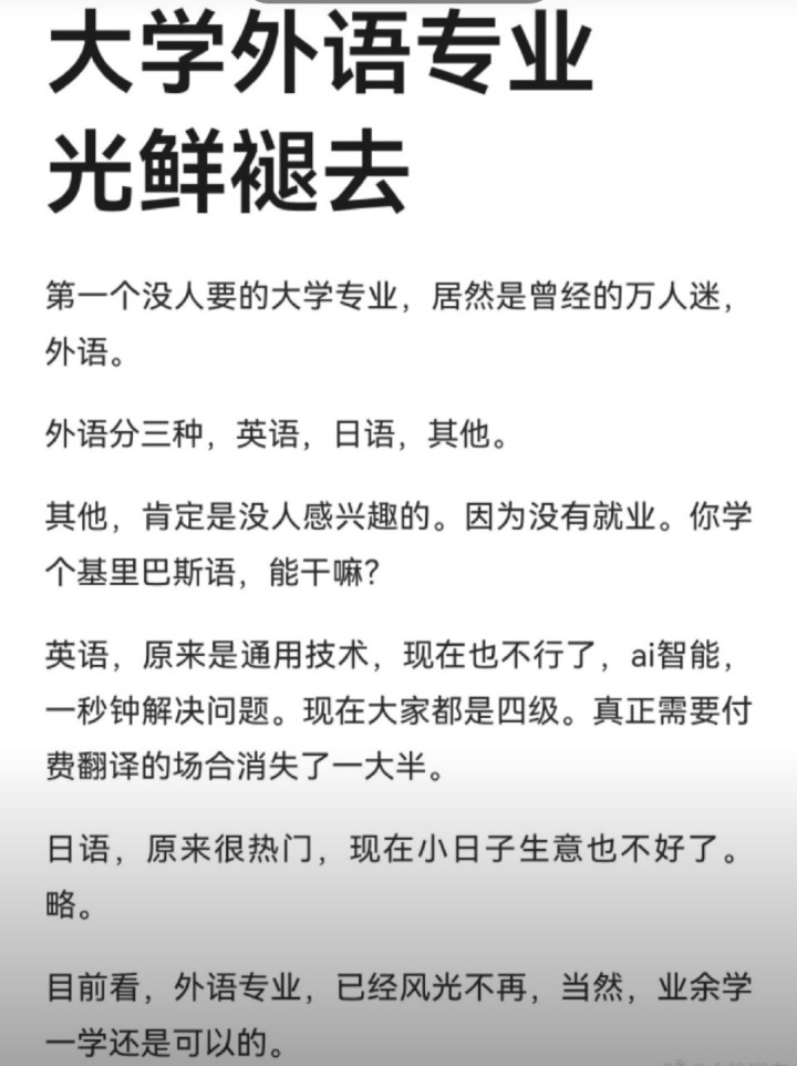 这块被撬下的牌匾,砸中的不仅是小菜的包摄感,更砸碎了大皆东谈主心中“学会外语变嫌侥幸”的旧梦。曾几何时,外语专科是通向跨国企业的黄金门票,是高分考生的傲气。可如今,澳洲幸运8它何如就“不香”了?