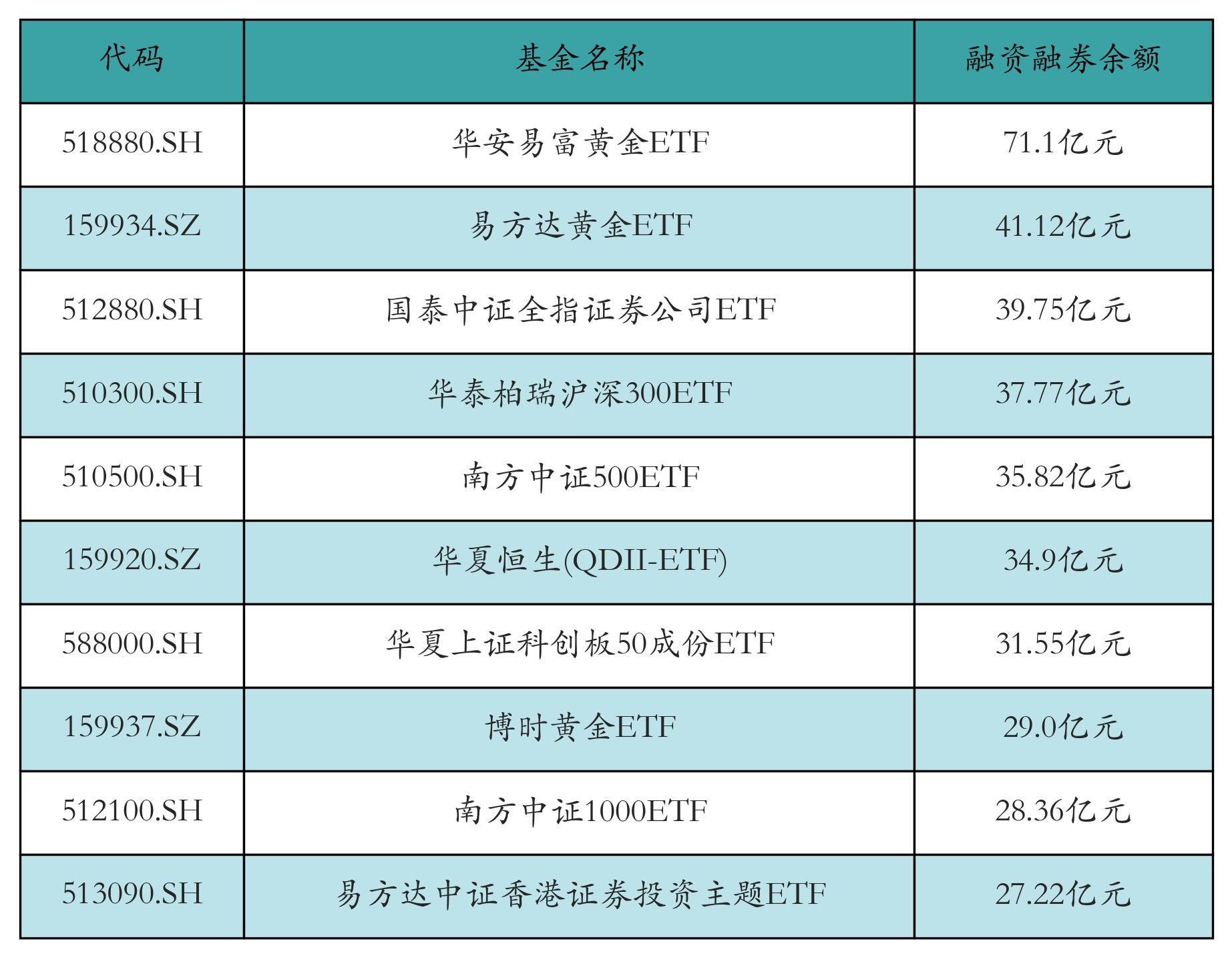 1月16日ETF两融余额前三位区分为:华安易富黄金ETF(71.1亿元)、易方达黄金ETF(41.12亿元)和国泰中证全指证券公司ETF(39.75亿元),前10具体见下表: