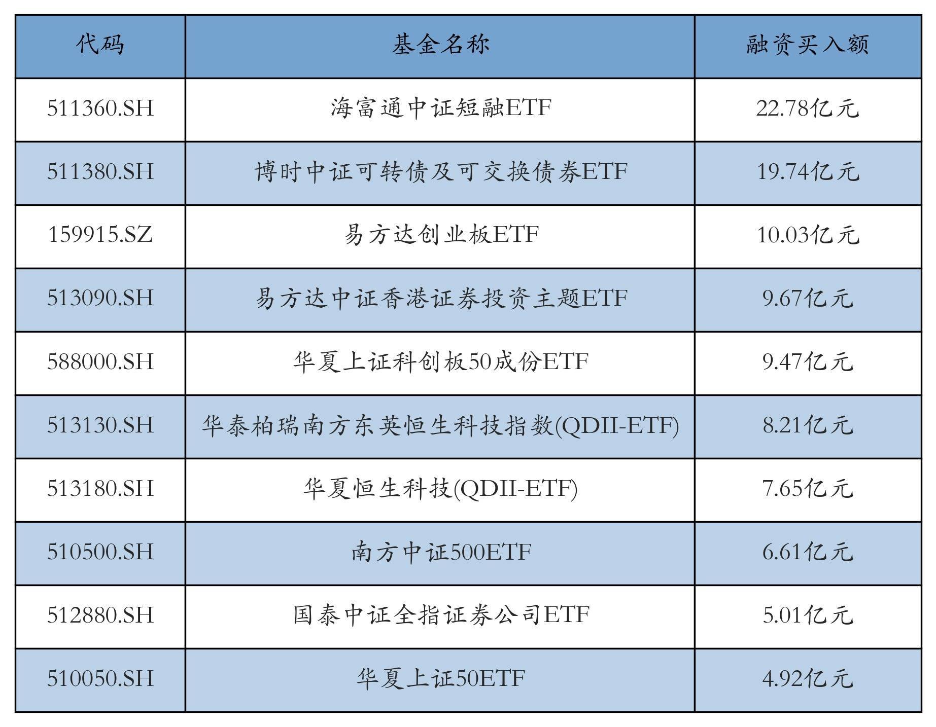 1月16日ETF融资买入额前三位区分为:海富通中证短融ETF(22.78亿元)、博时中证可转债及可交换债券ETF(19.74亿元)和易方达创业板ETF(10.03亿元),前10具体见下表: