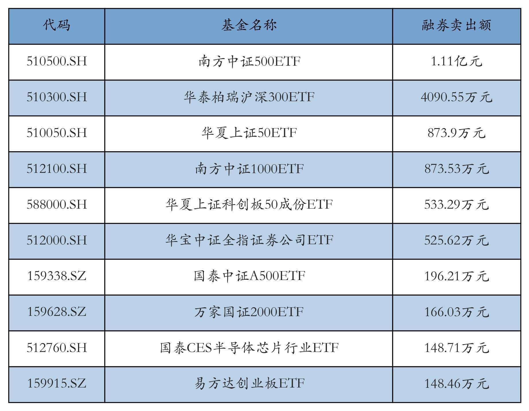1月16日ETF融券卖出额前三位区分为:南边中证500ETF(1.11亿元)、华泰柏瑞沪深300ETF(4090.55万元)和中原上证50ETF(873.9万元),前10具体见下表:
