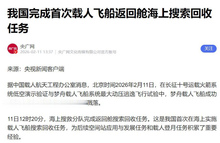 2026年2月11日,我国完成初次载东说念主飞船复返舱海上搜索回收任务。回收这件事,不是噱头,而是把航天从“国度荣誉神色”转向“可赓续产业才气”的鲜艳动作。